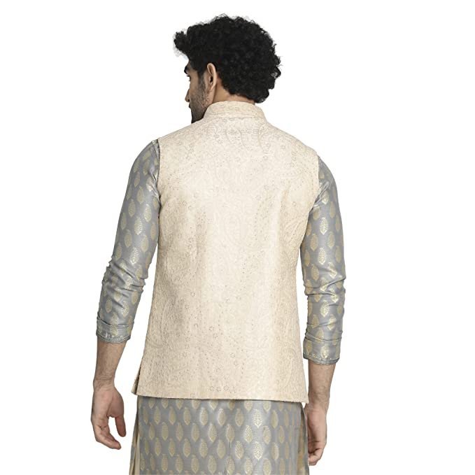 Manyavar Men’S Art Silk Traditional Nehru Jacket Waist Length Festive – Biscuit , XL
