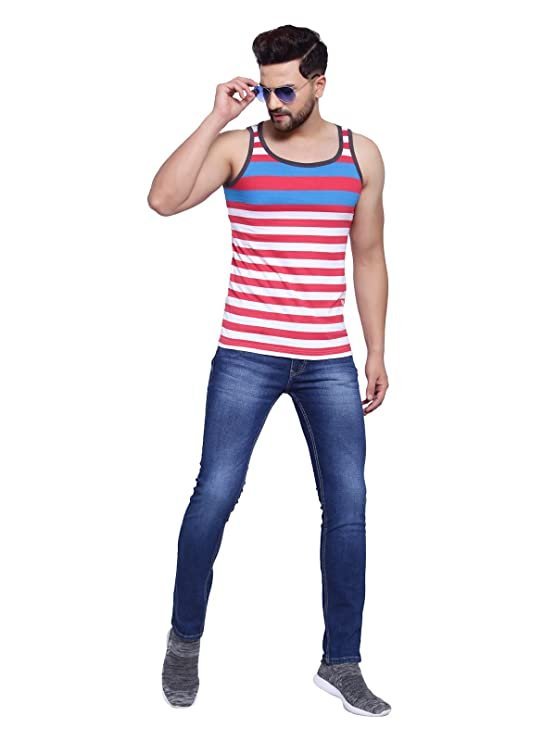 A STYLE STATEMENT: Traditional U-neckline, a sleeveless design, and stripes make this cotton vest for men ideal for a beach day, pool parties, and gym sessions